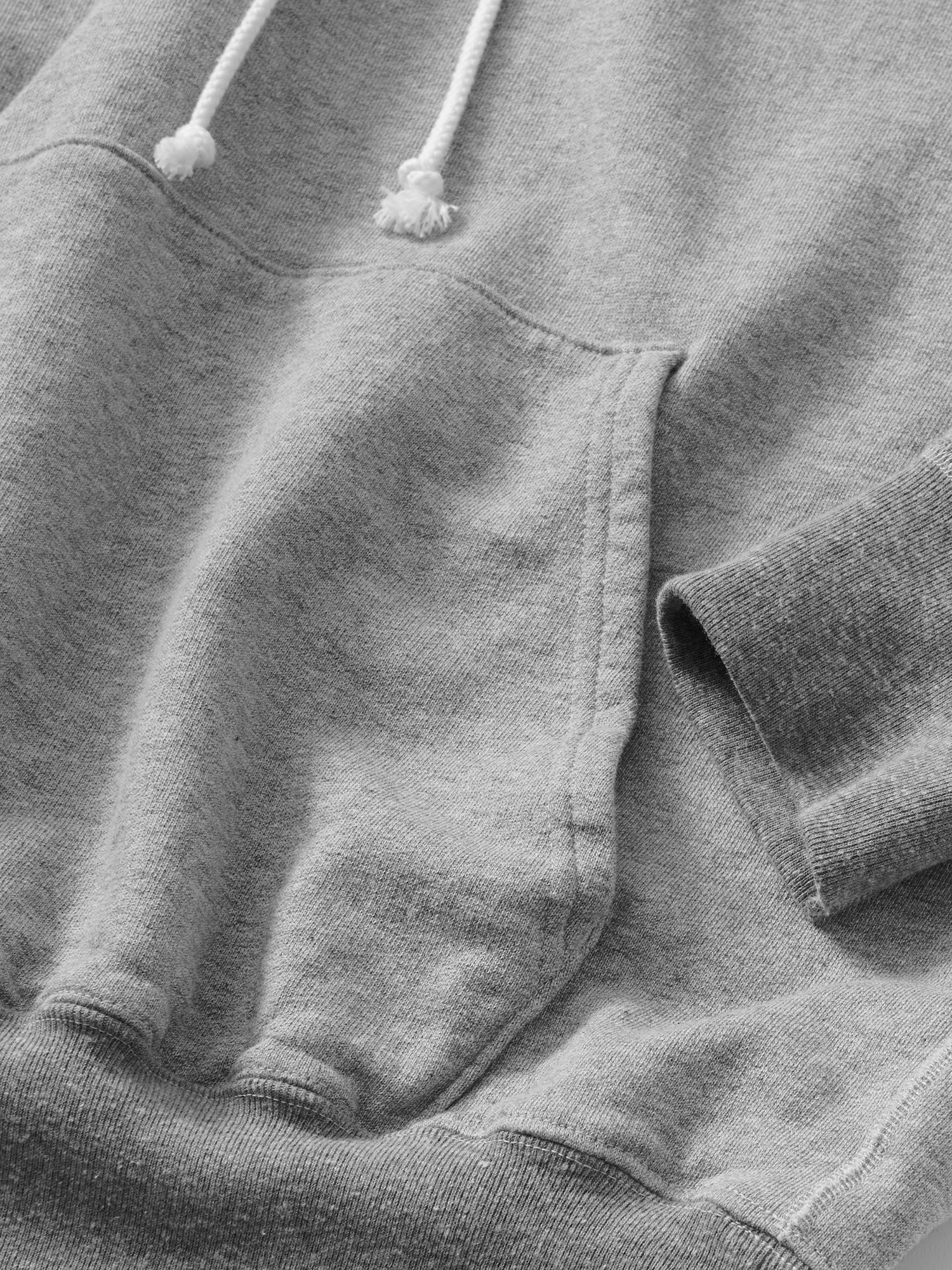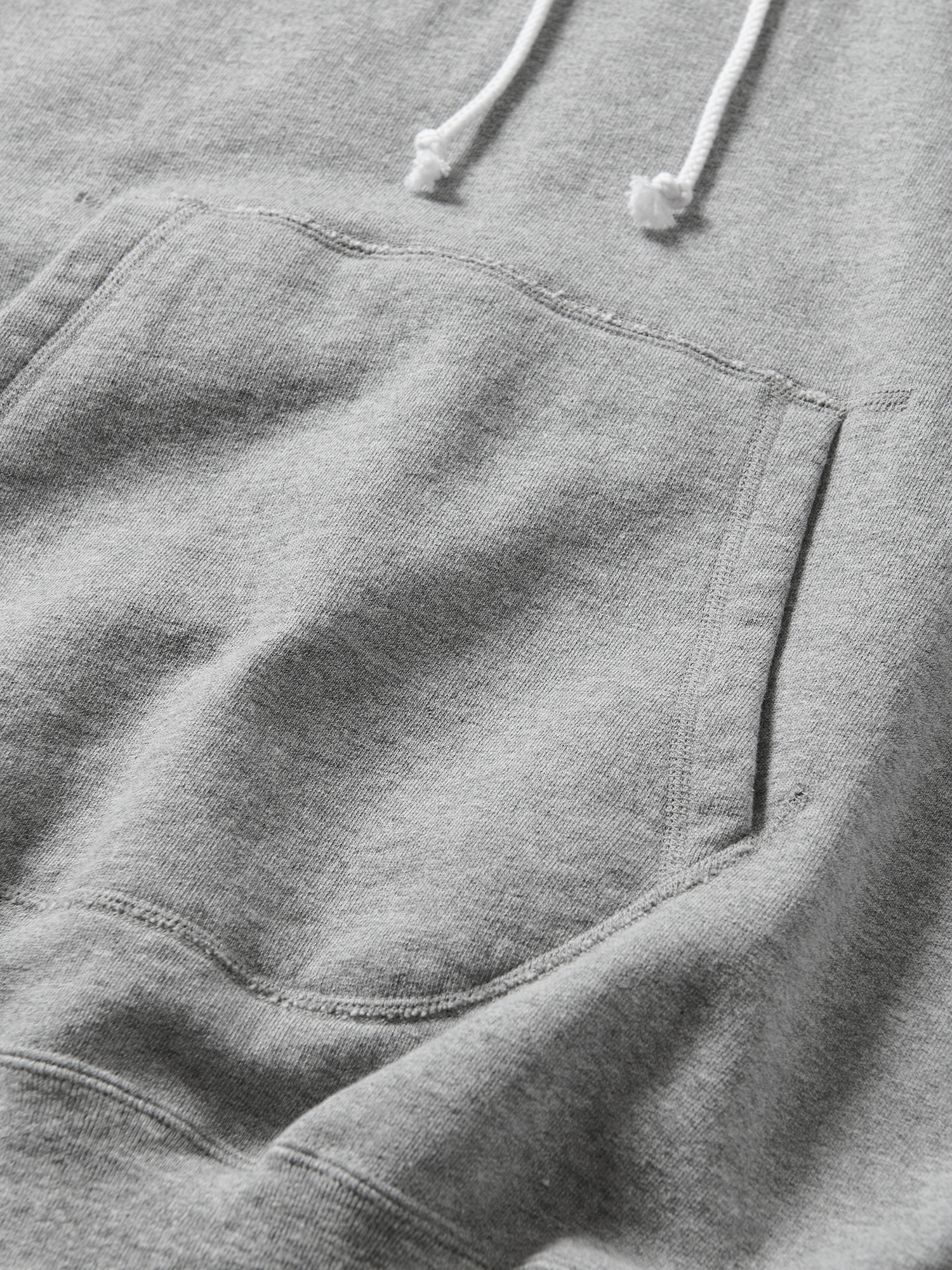 通称“カンガルーポケット”と言われる、スウェットフ―ディーの象徴的なディテールの一つであり、メーカーや商品による個性が分かりやすく表現される部分。