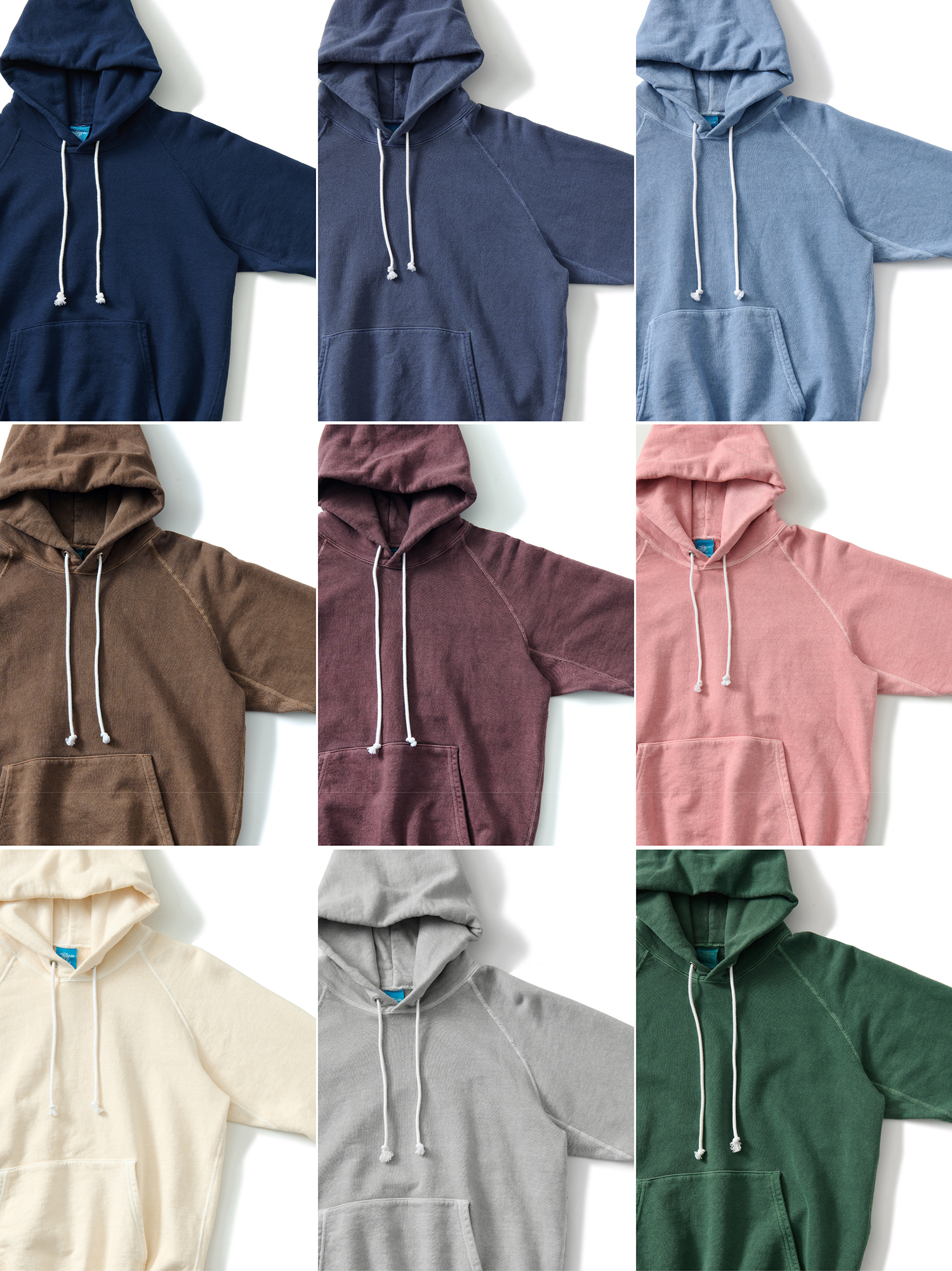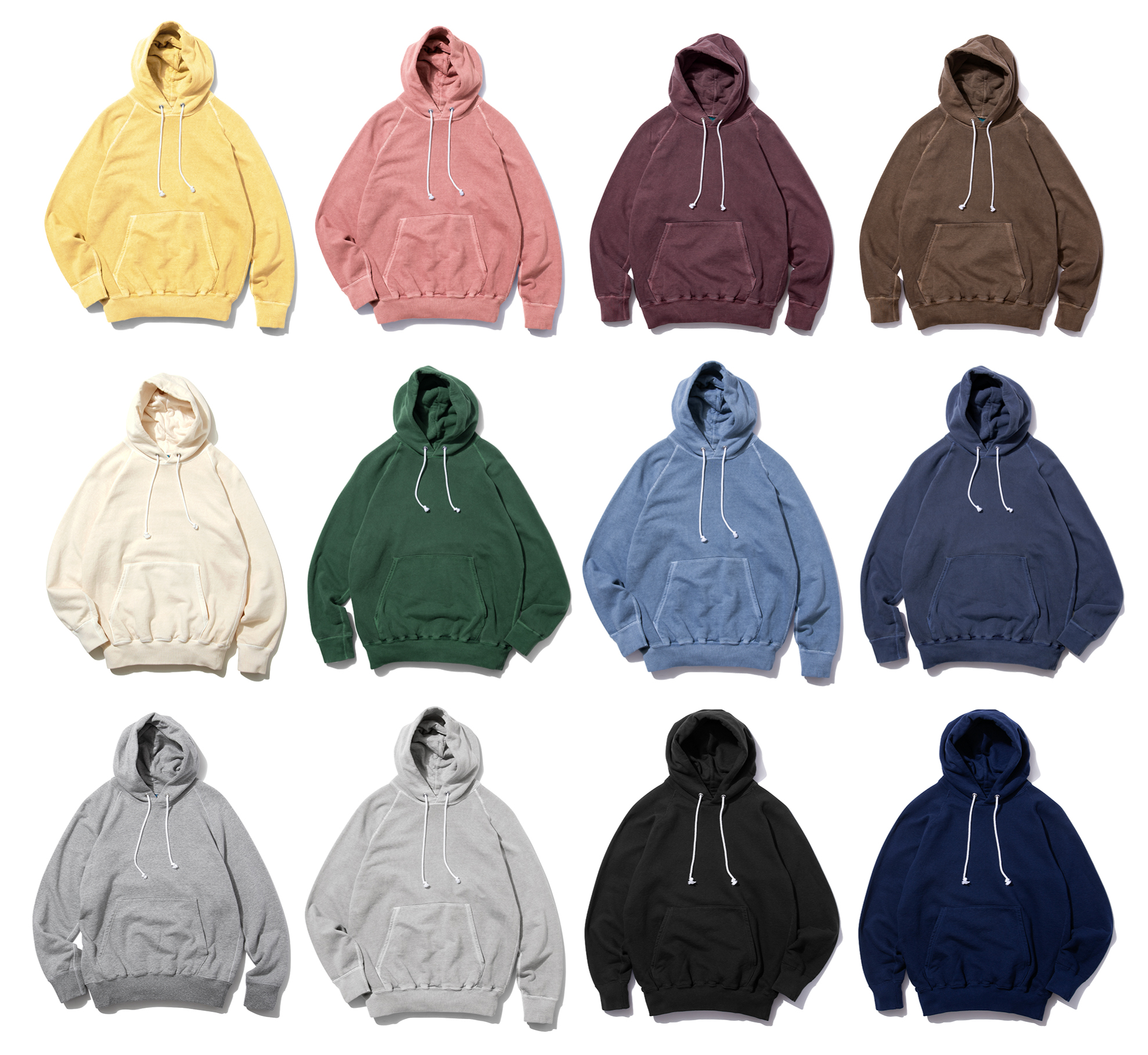 RAGLAN CREW SWEAT、RAGLAN PULLOVER HOOD SWEAT、RAGLAN ZIP HOOD SWEAT の3品番を展開しており、どれもブランドを代表するロングセラー商品となっています。